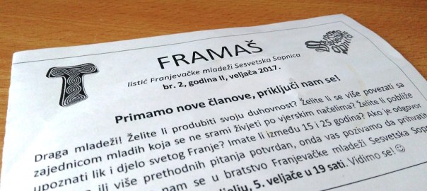 U cilju boljeg informiranja župljana o svim svojim aktivnostima Franjevačka mladež naše župe pokrenula je info-listić pod nazivom “Framaš” koji besplatno možete uzeti na stolu za tisak pod svetim misama posljednje nedjelje u mjesecu.
